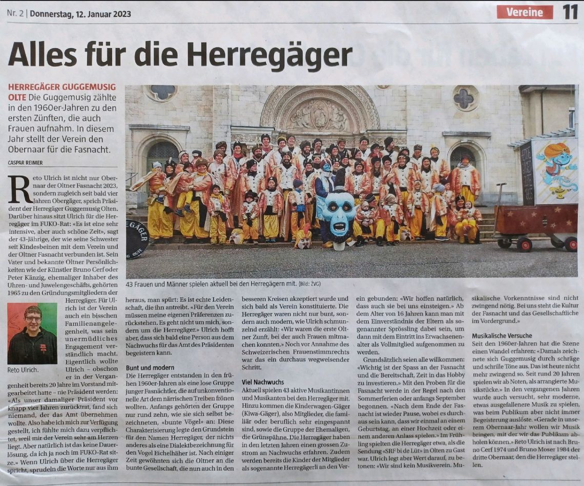 Zeitungsbericht Herregäger Guggemusig Olte - Donnerstag, 12. Januar 2023